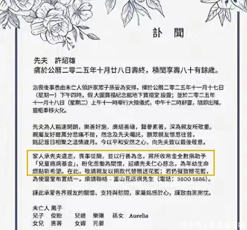不时向将白色信封参加箱中的来宾鞠躬——那边装着所有帛金,行将化作“儿童癌症基金”的善款。这恰是许绍雄生前终末的布局:让告别典礼成为公益艰难站。