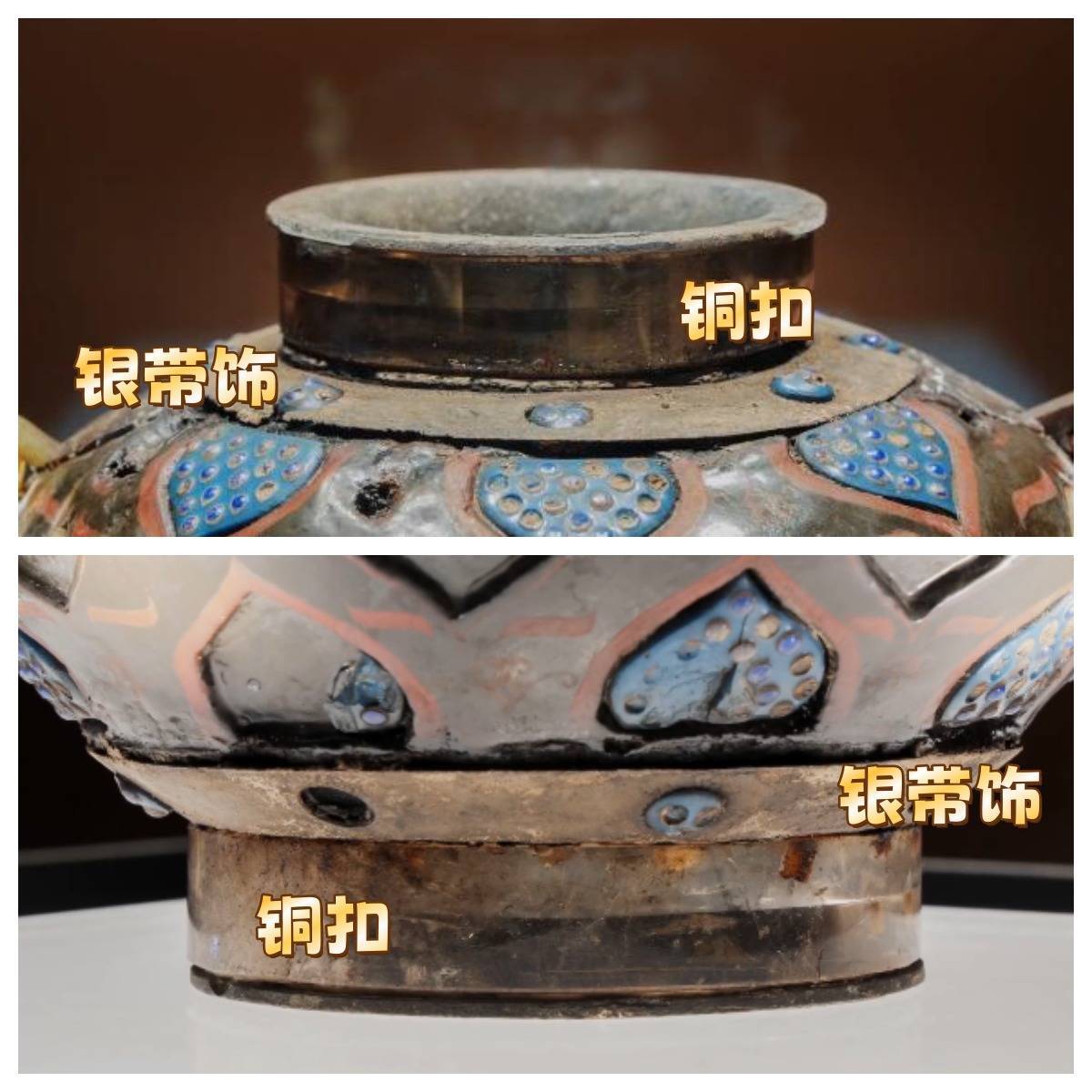 r罐口颈部与圈足部嵌入了铜扣
